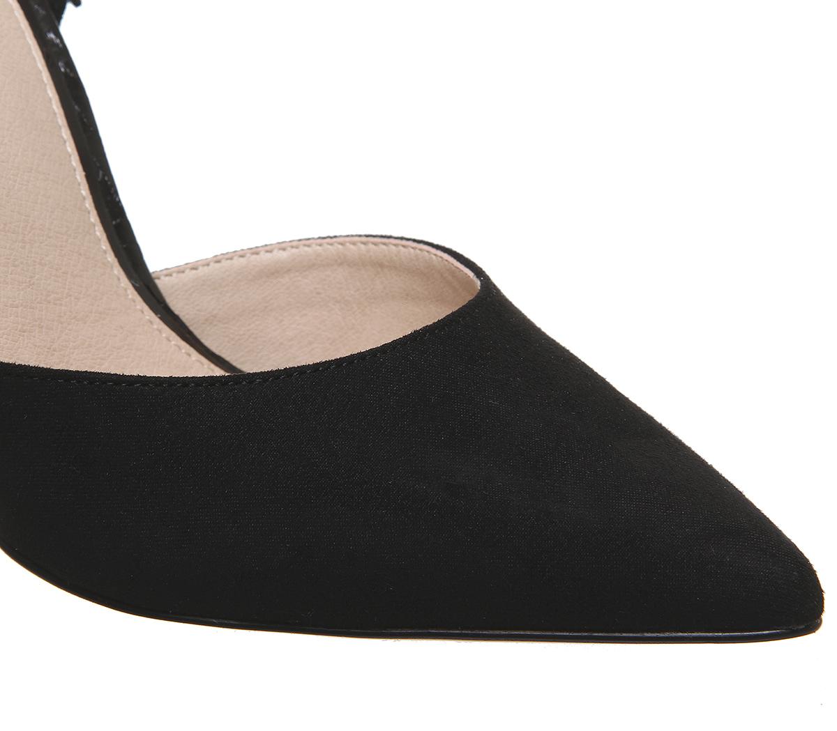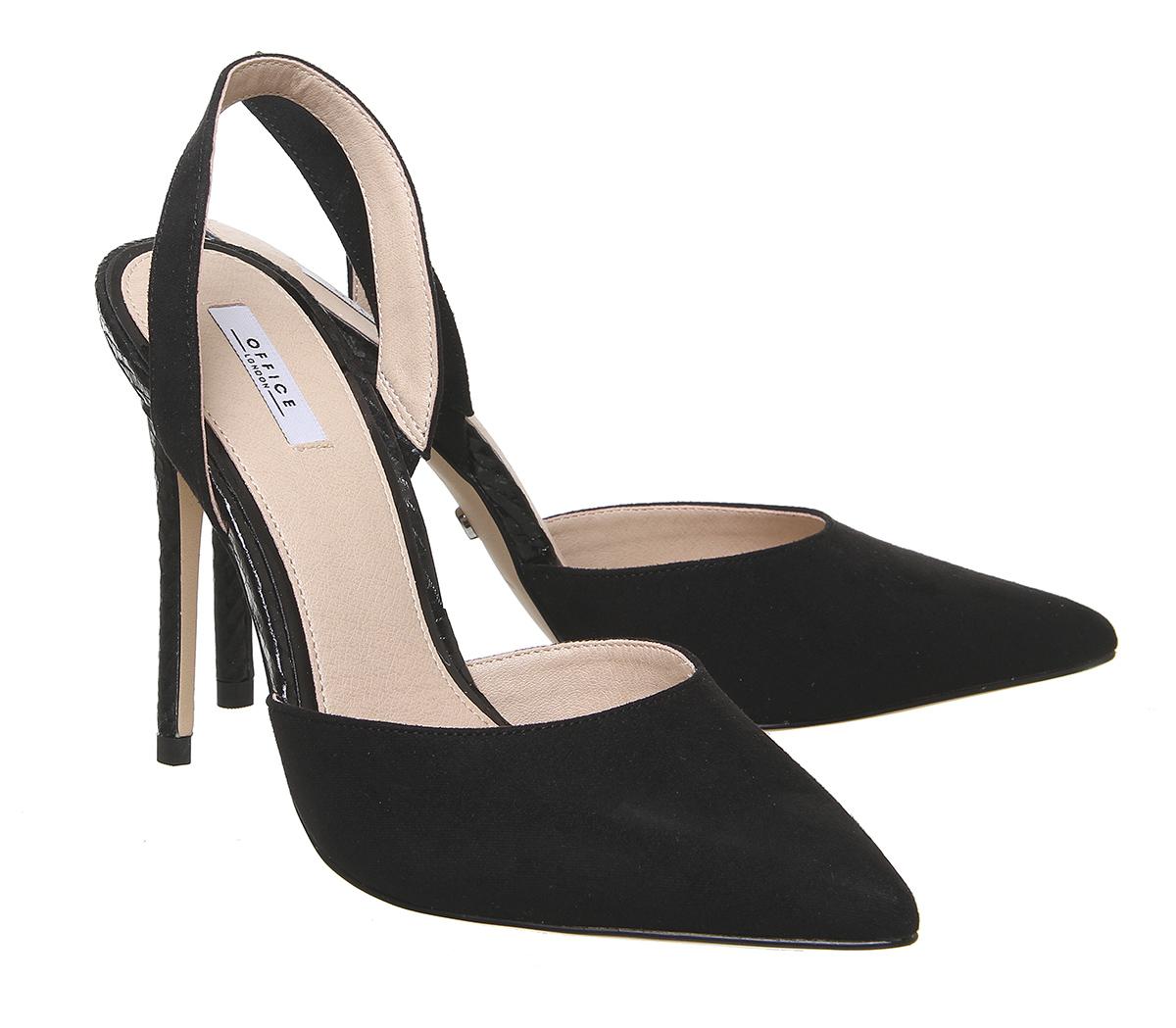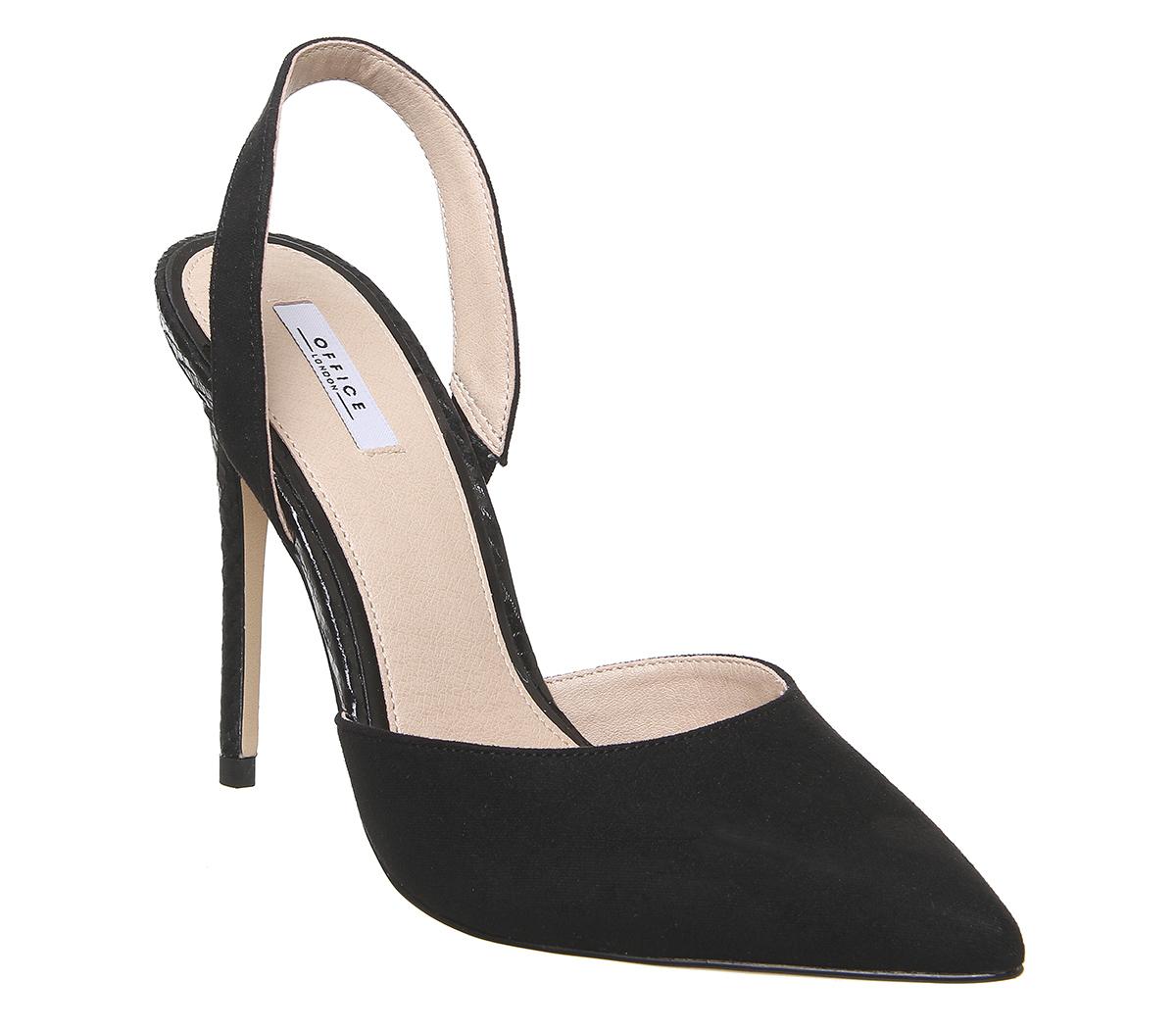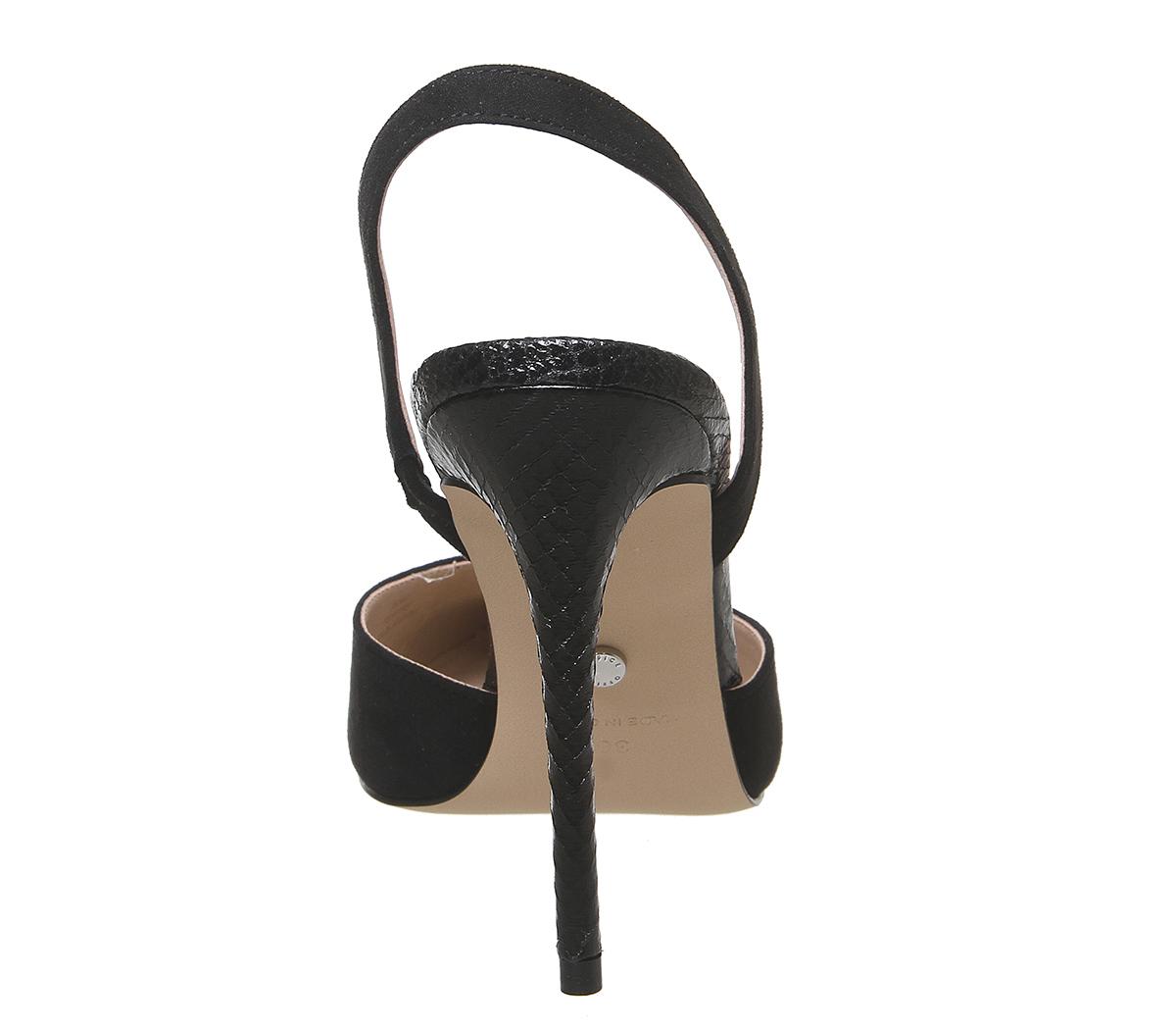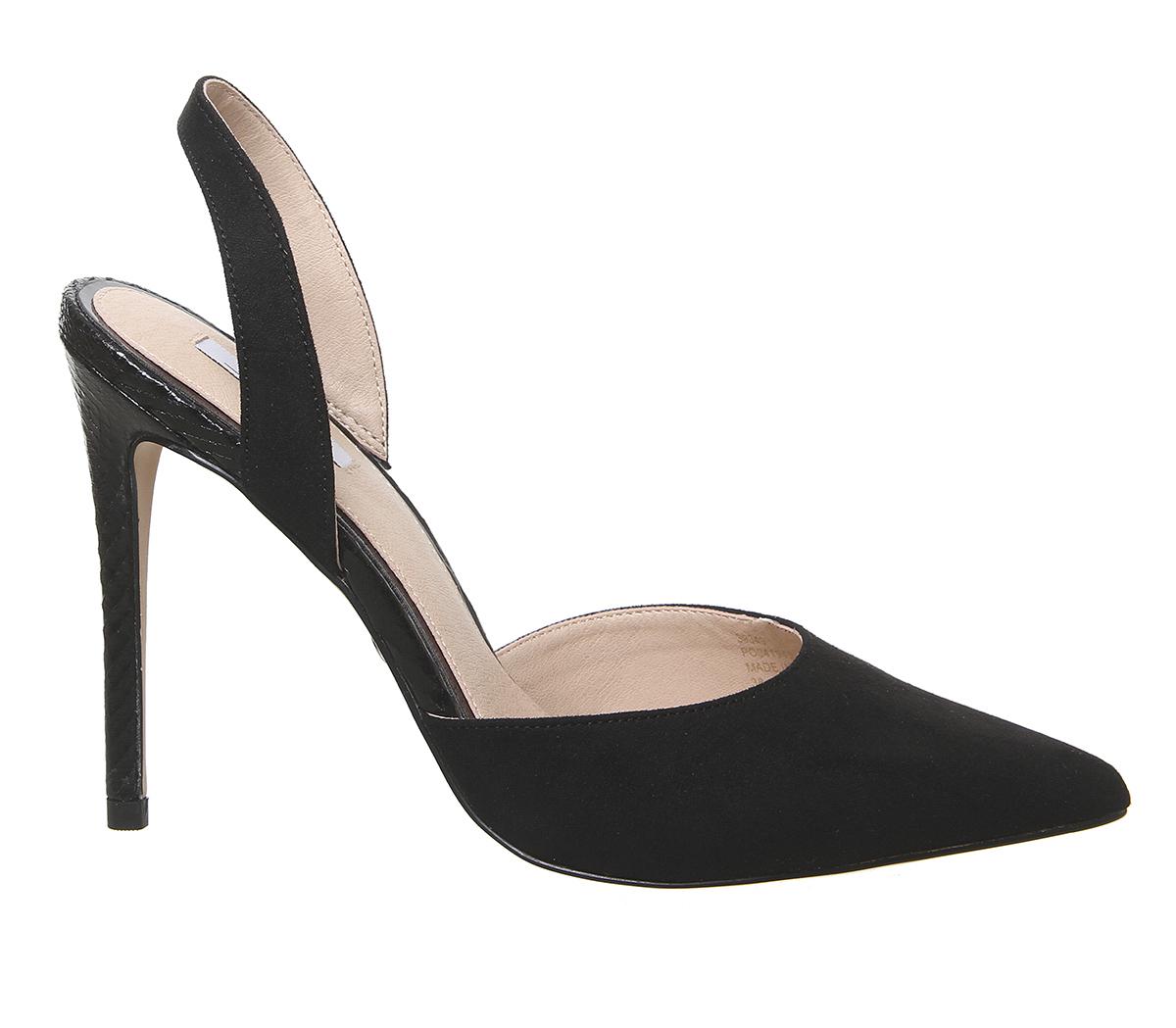 A chic, glam pointed heel to dress up an outfit. Featuring a mixed textured upper with a slinky slingback and tall skinny heel