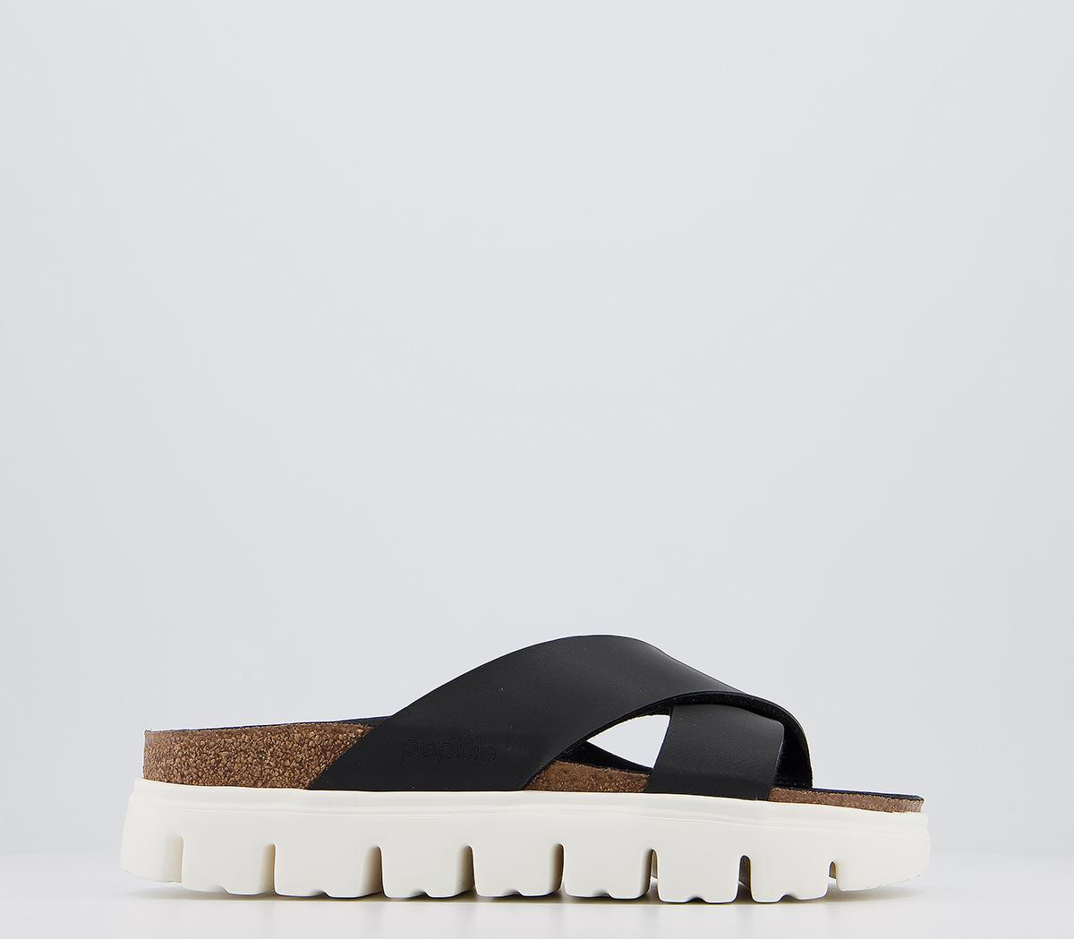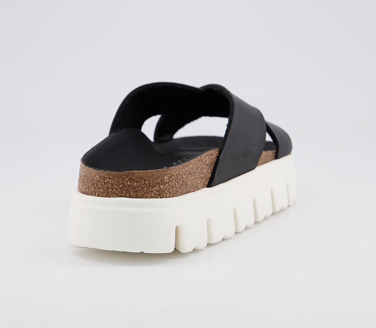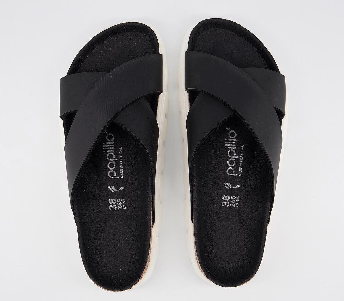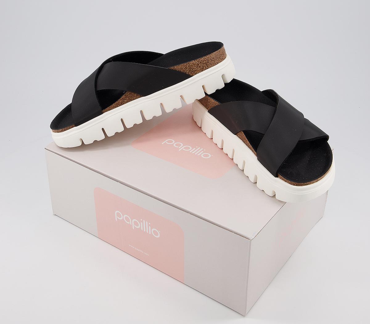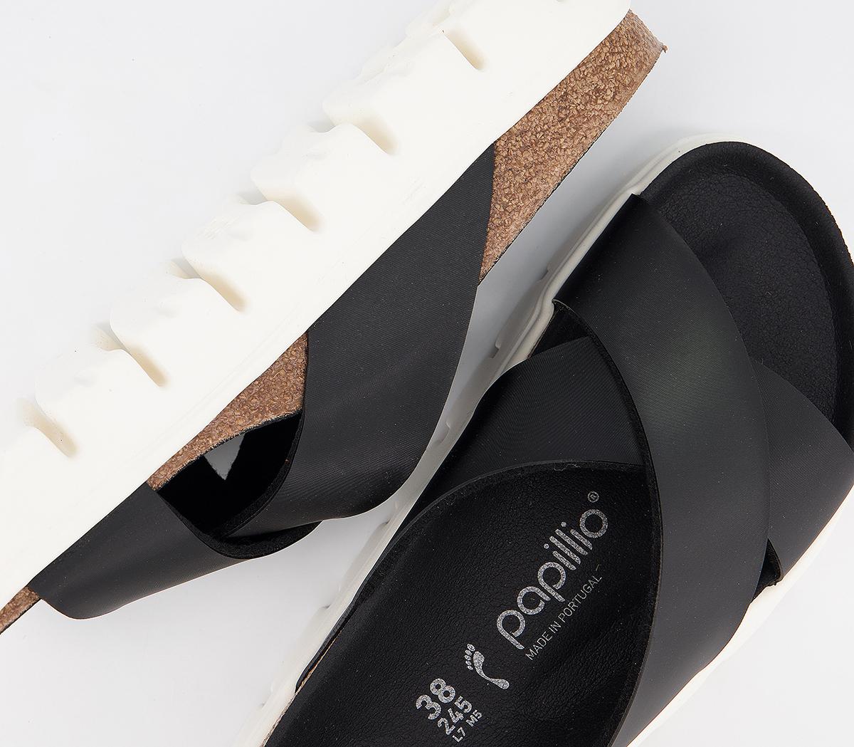 Introducing the new Papillio collection from Birkenstock. Reimagining classic silhouettes with a new wedge heel or a trendy platform sole. This iteration of the Daytona, comes with a black Birko-flor leather imitation double strap, microfibre lining and a chunky sporty EVA sole.
