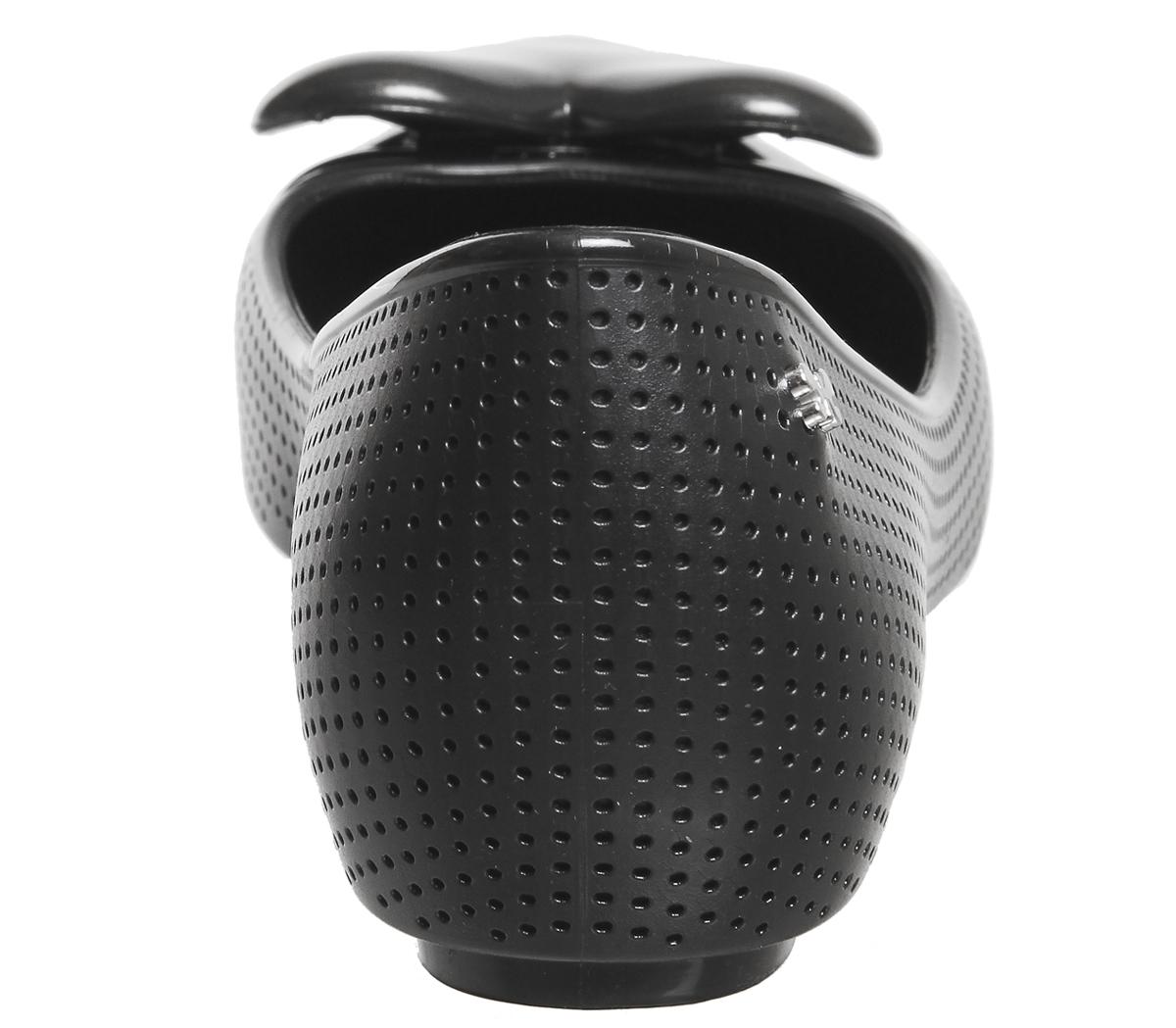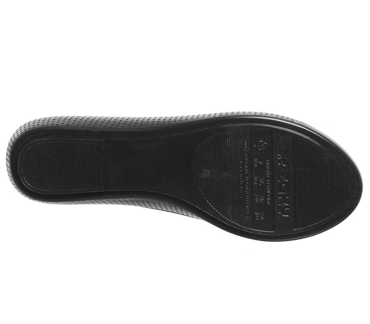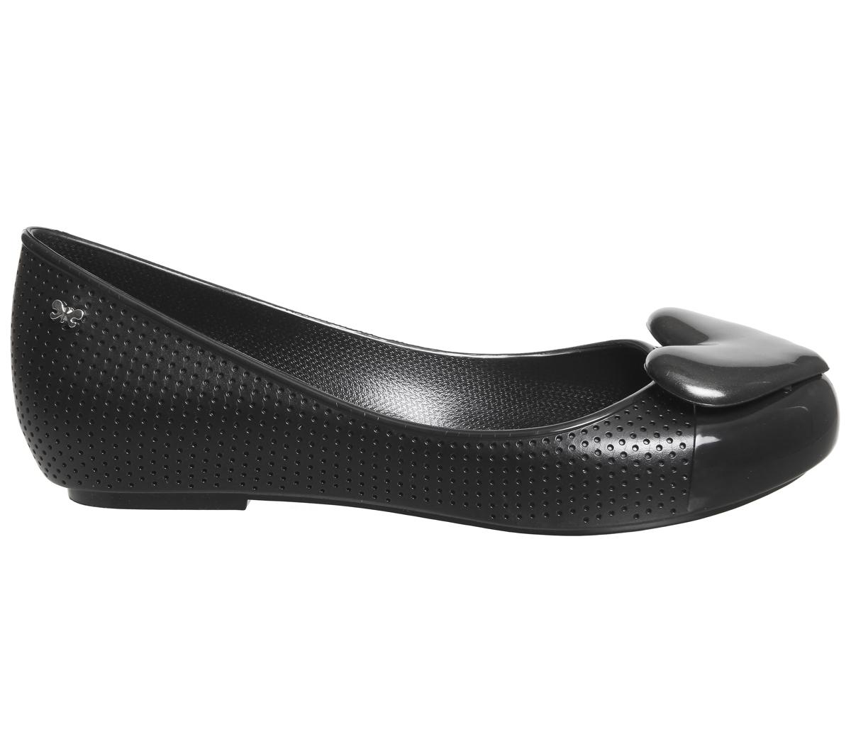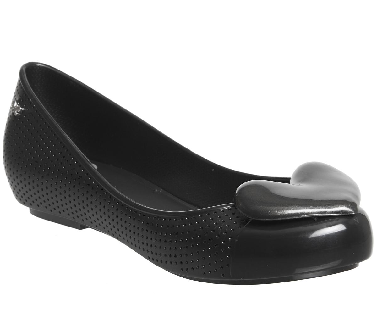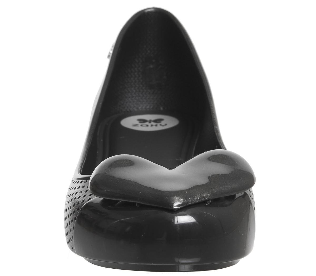Der Pop Beauty Pumps von Zaxy präsentiert sich mit einem schwarzen Obermaterial aus glänzendem, synthetischem PVC mit perforierten Elementen, einer runden Zehenpartie und einer farblich passenden Herzapplikation.
