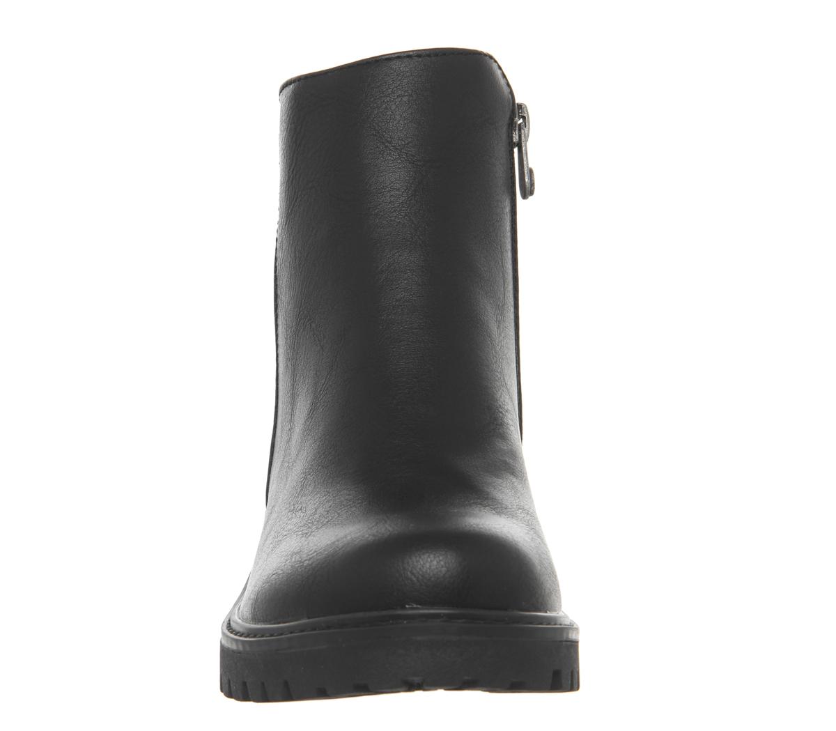 Veganer Chelsea Boot mit femininem Charme und robustem Flair. Das Obermaterial aus schwarzem Synthetik thront auf einer dicken Gummisohle mit tiefem Profil.